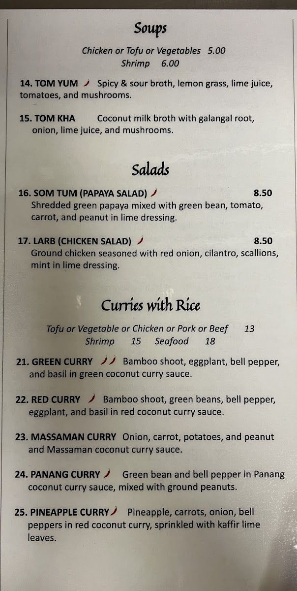 What I love most is how the menu balances heat and flavor. Whether you’re in the mood for something mild and creamy or craving that fiery kick Thai food is famous for, there’s plenty to explore. The appetizers alone - from fresh spring rolls to crispy Thai dumplings - are perfect for sharing, though you might not want to. Add in hearty rice dishes, savory soups, and a few sweet treats to finish, and it’s easy to see why locals keep coming back for more.